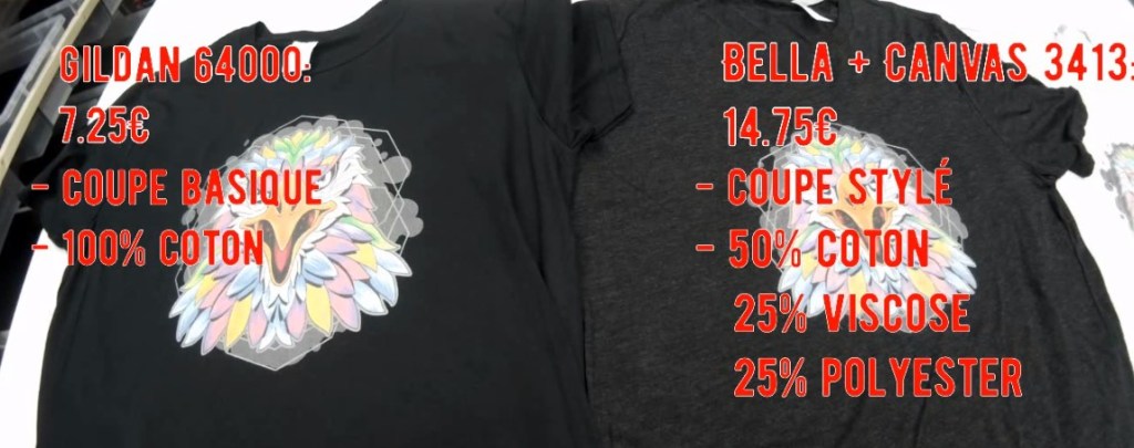 D’abord le prix, pour du print on demand et chez le fournisseur Printful, le Gildan 64000 est vendu 7.25⏠HT avec l’impression, le Bella + canva 3413 est vendu 14.75⏠HT avec l’impression.
